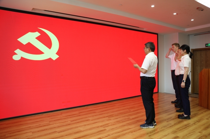 黨委副書(shū)記、監(jiān)事長(zhǎng)沈?yàn)槊駧ьI(lǐng)預(yù)備黨員入黨宣誓;